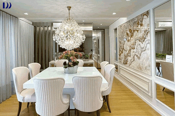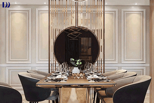می توانید بااستفاده از طرح های مدرن قاب سازی طرح و بافت ویژه ای به دیوار ناهار خوری بدهید و یا با ترکیب سنگ اسلب دیواری نئوکلاسیک داشته باشید.