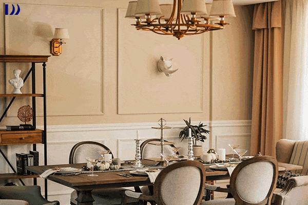 می توانید در قسمتی که میز نهار خوری را گذاشته اید به شکلی متفاوت تزیین کنید و برای این کار دیواری که در مجاورت میزناهارخوری است را متفاوت و خاص تر انجام دهید. کافی است از کاغذ دیواری با طرح و رنگی دیگر استفاده کنید و برای خاص تر شدن این کار، قاب هایی را روی دیواری تعبیه کنید و سپس به جای اینکه کل دیوار را با کاغذ دیواری، دیوارپوش کنید فقط درون قاب ها این کار انجام دهید.